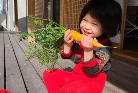 我が家の畑で取れたニンジン🥕にかぶりつく娘。 甘くて美味しい! って言った私の真似をして、娘も全く同じことを言…