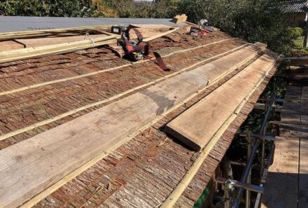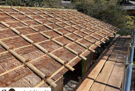 屋根の杉皮葺きが始まっています。 茅葺き屋根などの防水下地にも、杉皮が使われています。 今回は、杉皮だけの屋根納まりです。 …