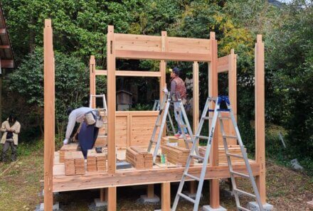 お手軽石場建ての板倉小屋 屋根は杉皮で葺きます 住幸房では初の試みです 出来上がりが楽しみ! https://fb.wat…