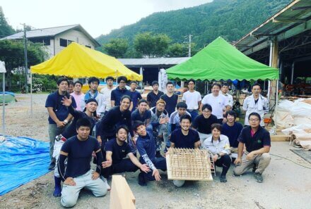 毎年恒例の、九州産業大学 住居インテリア学科の実習で、 大学生が住幸房の作業場の見学に来ました。 この日は、実際の木造建築の現…