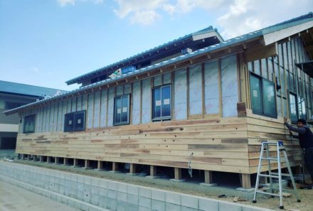 外壁の下見板を張り始めました。無塗装の予定です。 この、杉板の雰囲気、好きです。なんとも言えない、柔らかさ、温もり、優しさがあり…