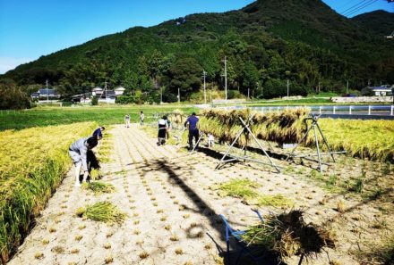 台風一過、本日、稲刈りしました。 刈り終えた稲は、約1ヶ月間掛け干しして、乾燥と熟成を進めます。 掛け…